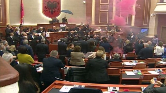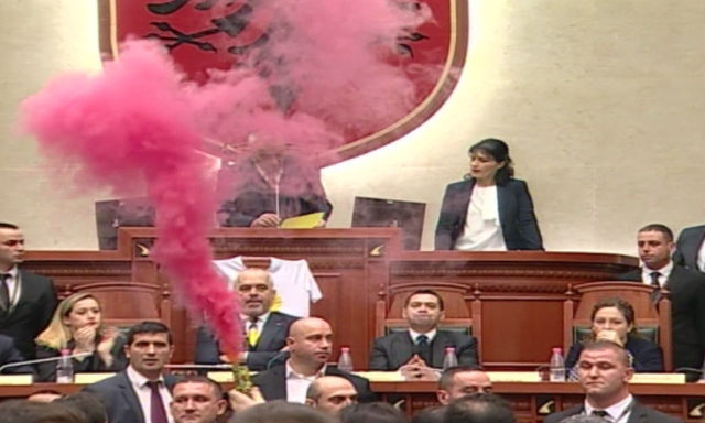 Pak minuta më vonë, deputetët e PD-së kanë hedhur tymuese drejt foltores dhe vendit ku janë kryeministri e ministrat.