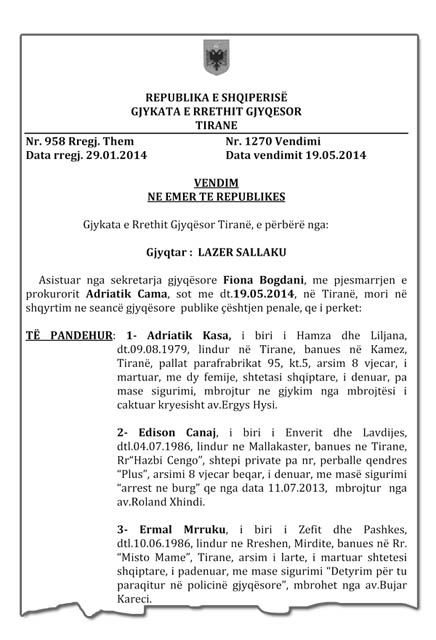 Gjatë shqyrtimit të dosjes, gjyqtari Lazër Sallaku, në maj të 2014-s, ka shpallur pafajësinë ndaj Ermal Mrrukut, e cila sipas tij thuhet se ish-gardisti nuk është përfshirë në krim. Ndërsa Adriatik Kasa është shpallur fajtor dhe është dënuar me 2.8 vite burg. Canaj është dënuar me 2.4 vite burg. Ndërkaq, burimet e prokurorisë thonë se ish-gardisti i ka kërkuar sërish para nga muaji shtator 2013, deri në muajin shkurt 2014. Ai e kërcënonte E.H., se nëse nuk i jepte para, do t’ia dorëzonte fotografinë bashkëshortes së tij. S.M.