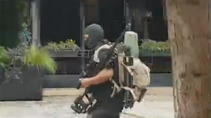 Banesa nga e cila po qëllon ky shtetas është e rrethuar dhe Policia ka vendosur një perimetër të gjerë rrethimi, për të parandaluar dëmtimin e kalimtarëve të tjerë të rastit.