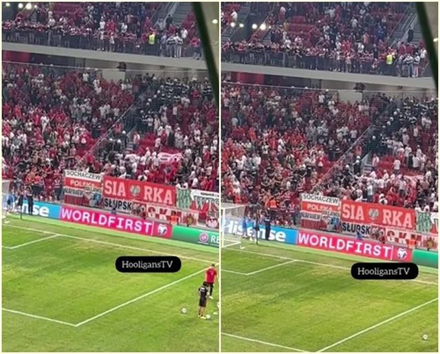 Tifozët polakë nisin të lëshojnë disa sende të forta në drejtim të tifozëve të kombëtares tonë.