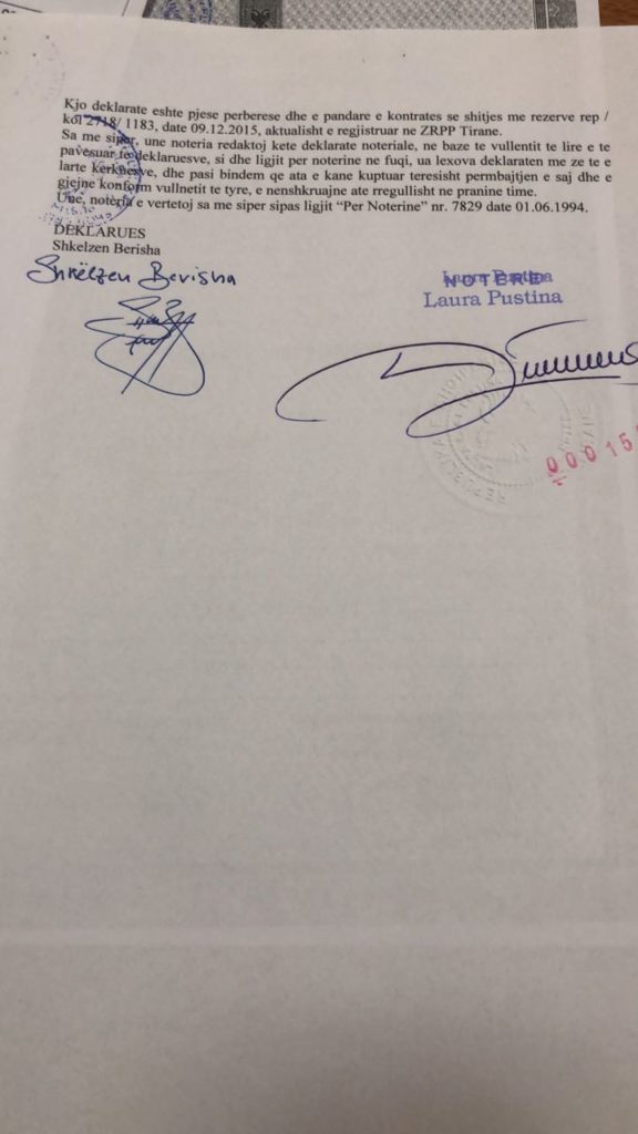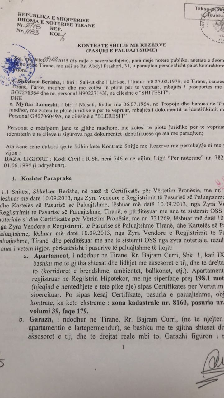 Ne kemi mundur të sigurojmë kontratën e noterizuar të shitjes së një apartamenti në Tiranë, rreth 200 metra katrorë nga Shkëlzen Berisha në fund të 2015-ës, në 9 dhjetor, 2015.