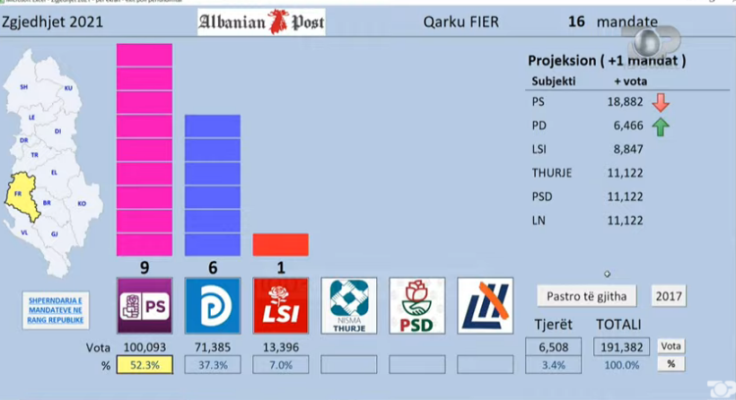 Këto vota përkthehen në 9 mandate. Ndërkohë PD ka fituar 37.3% të votave.
