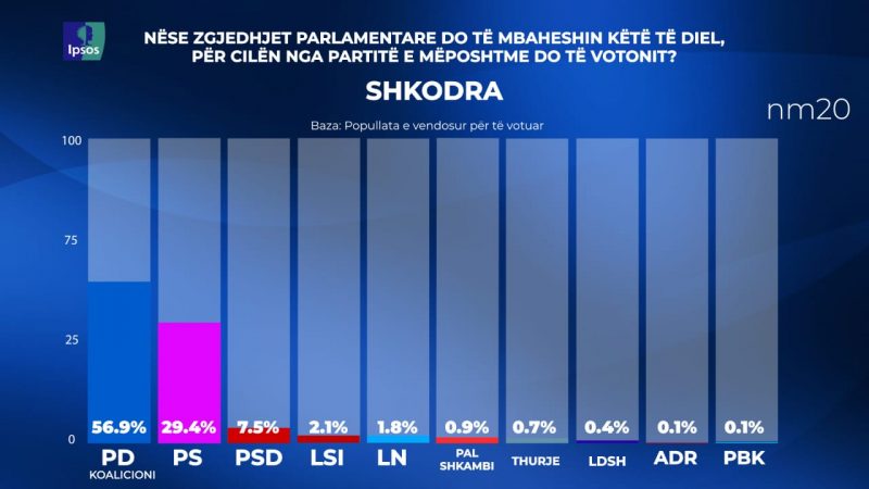 Nëse do të votohej këtë të diel, 56.9% e shkodranëve do të votonin Partinë Demokratike. Sipas sondazhit të gjigandit IPSOS në bashkëpunim me Top Channel, referuar të anketuarve, rezulton se 29.4 % e shkodranëve do të votonin Partinë Socialiste.