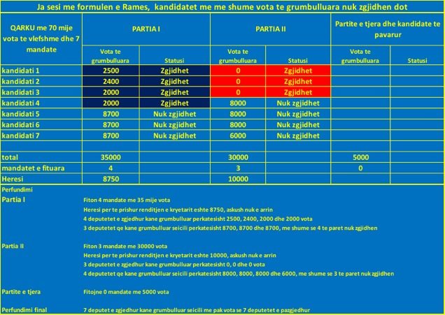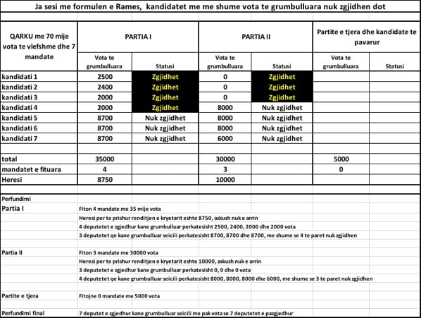 Ai paraqet një tabelë të thjeshtë me skemën e llogaritjes sipas nenit të këtij Kodi të propozuar nga PS, ku në zonë me 7 deputetë me 35 mijë zgjedhës, rezulton që ai që ka marrë më shumë vota se partia mbetet jashtë Parlamentit.