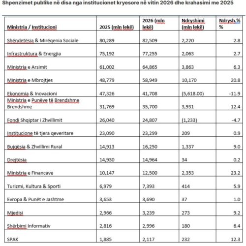 Institucioni i dytë që parashikohen më shumë shpenzime është Ministria e Infrastrukturës me 772 milionë euro. Në këtë ritëm vijon dhe ministria e arsimit, buxheti i të cilës është rritur në 620 milionë euro. Ndërsa Ministria e Mbrojtjes do të ketë një buxhet 589 milionë euro. Ministria e Bujqësisë do të marrë 14 milionë euro më shumë duke arritur në një buxhet 162 milionë euro për 2026. .(grafik)