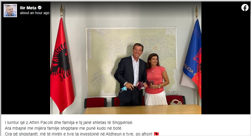 I lumtur që z.Afrim Pacolli dhe familja e tij janë shtetas të Shqipërisë.