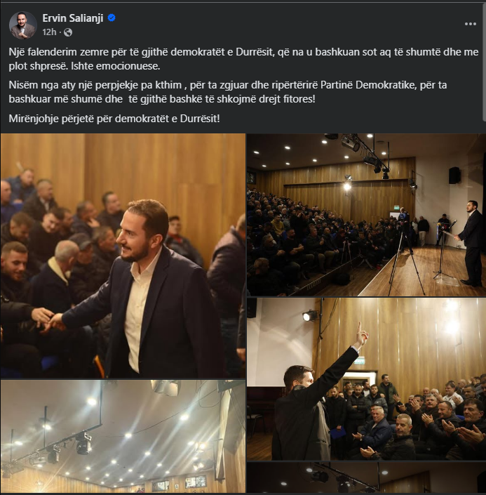 “Një falenderim zemre për të gjithë demokratët e Durrësit, që na u bashkuan sot aq të shumtë dhe me plot shpresë. Ishte emocionuese. Nisëm nga aty një përpjekje pa kthim, për ta zgjuar dhe ripërtërirë Partinë Demokratike, për ta bashkuar më shumë dhe të gjithë bashkë të shkojmë drejt fitores! Mirënjohje përjetë për demokratët e Durrësit!”– shkruan Salianji.
