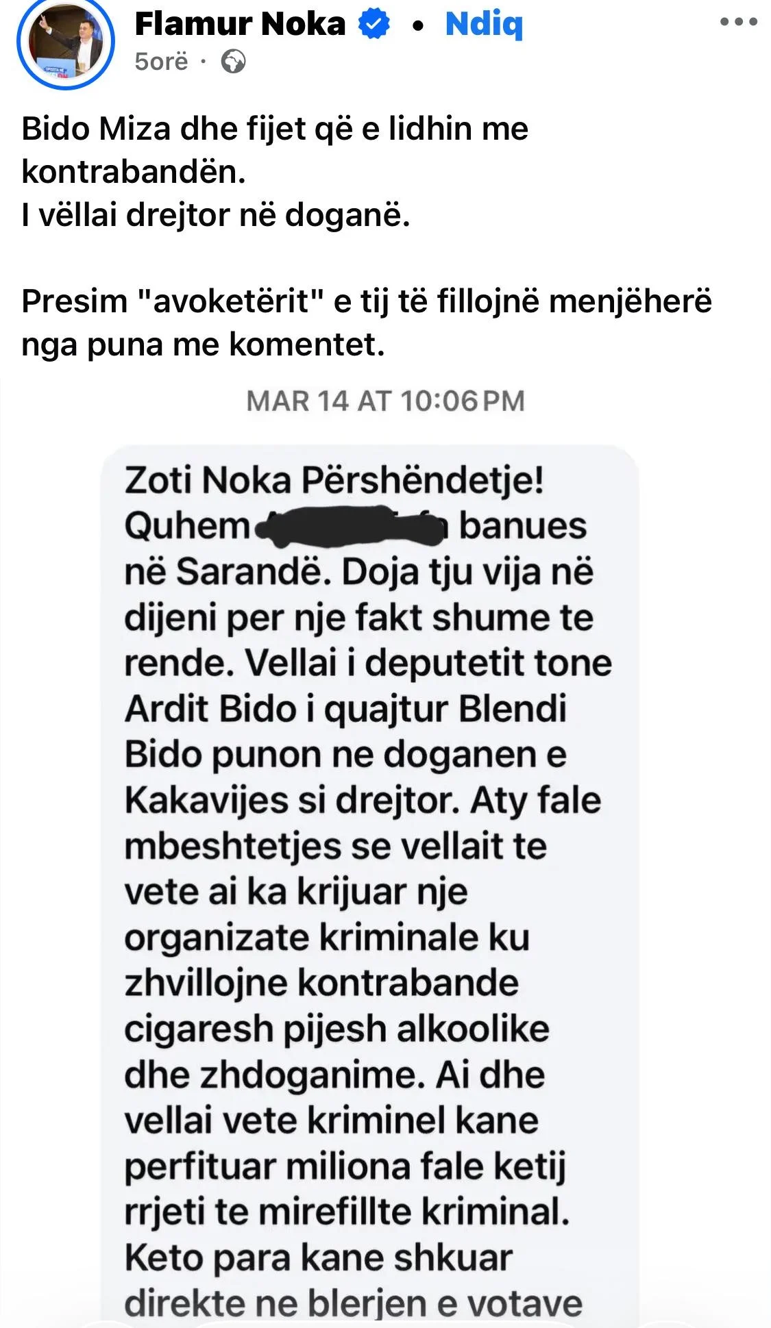 Mesazhin e shpërndarë, Noka e shoqëron me komentin: “Bido Miza dhe fijet që e lidhin me kontrabandën. I vëllai drejtor në doganë. Presim ‘avoketërit’ e tij të fillojnë menjëherë nga puna me komentet”.