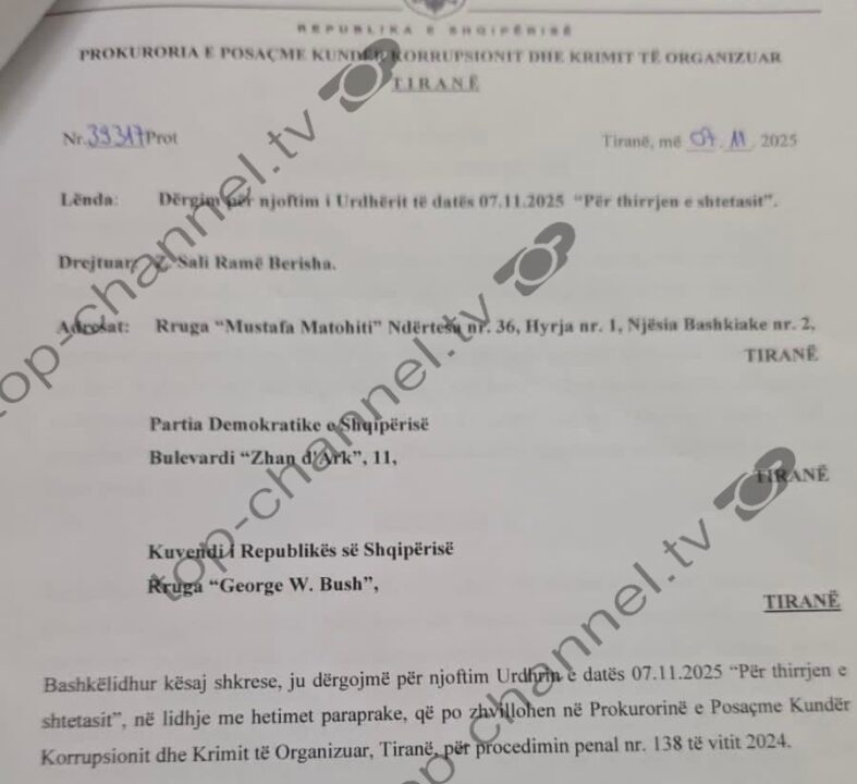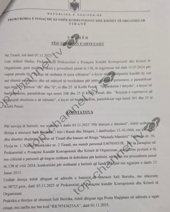 SPAK ka dërguar fletëthirrje për kreun e Partisë Demokratike, Sali Berisha në lidhje me hetimet për çështjen e 21 janarit si person në dijeni.