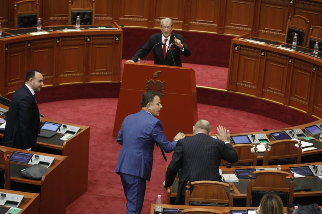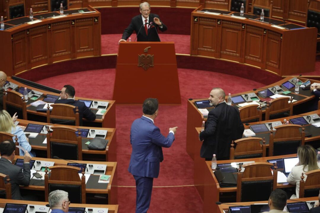 Edhe pse pa mikrofon, në debat i përfshi edhe deputeti demokrat Flamur Noka, i cili u çua nga vendi dhe iu afrua Ulsi Manjës.