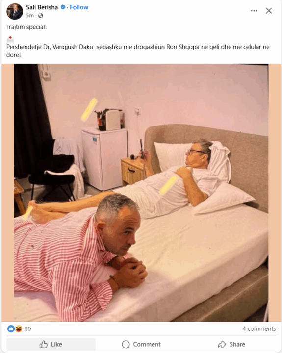“Në rast se ka të dhëna se fortoja është fake, unë menjëherë e heq. Qytetari dixhital funksionon me një burim. Çfarë kishte aty tani, aty kishte Vangjush Dako. A u burgos për të shkuar tek Veliaj? Është e vërtetë kjo. Është e vërtetë që u shtrua në spital Dako sepse i mjaftonin 4 ditë për të shkuar tek Veliaj? Është e vërtetë. Pastaj e kishin tepruar, kur pashë më vonë se ajo fotoja ishte një video intimiteti me shqopën, e hoqa menjëherë.”– tha Berisha.