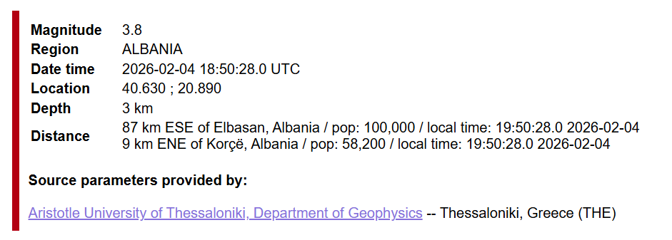 Një tërmet me magnitudë 3.8 ballë u regjistrua pak minuta më parë pranë qytetit të Korçës.
