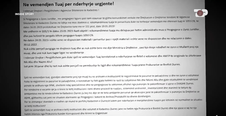 “Për të shmangur përsëritjen e situatës së shkatërrimit të dokumentacionit me ose pa dashje, kërkohet ndërhyrja e menjëhershme juaja në mbrotje të materialeve të rëndësisë së veçantë që kanë të bëjnë me pronat e qytetarëve të Durrësit”, thuhet në emailin e brendshëm të Kadastrës Durrës për eprorët në vitin 2023.