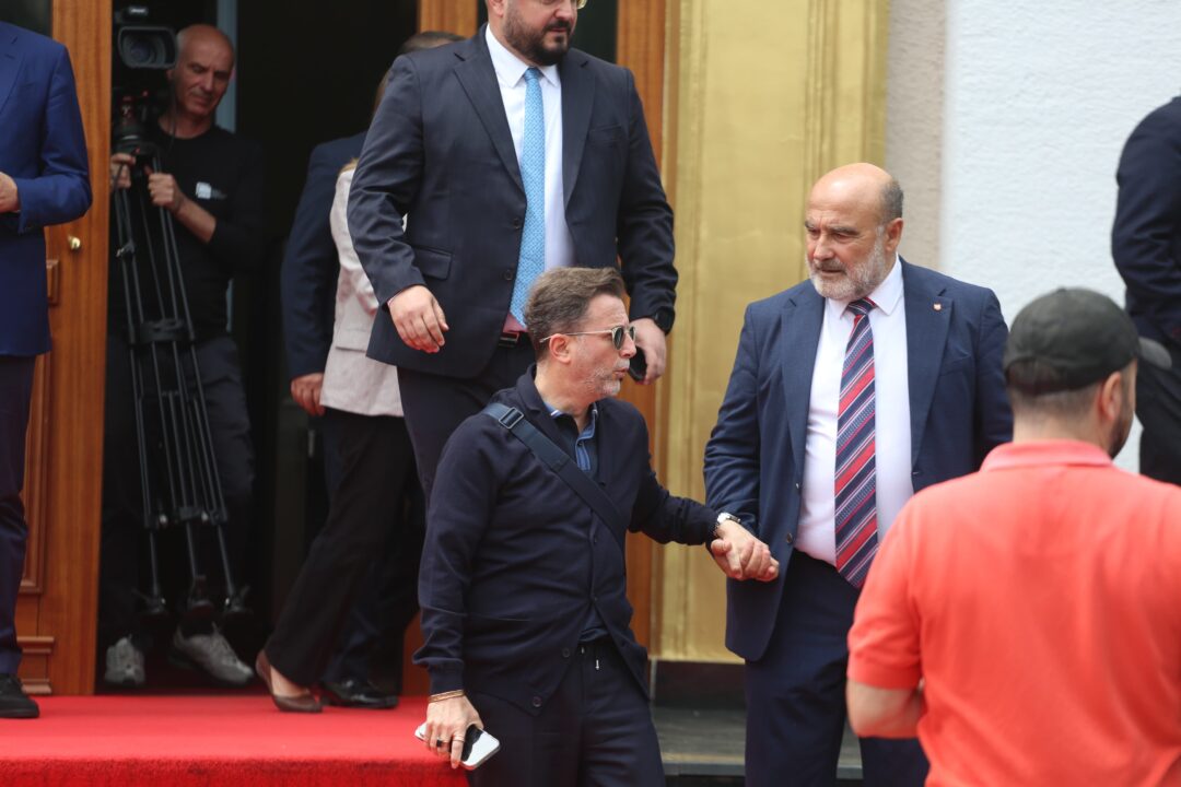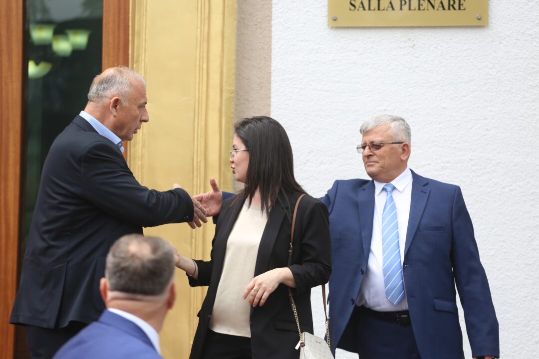 Dy ministret Anila Denaj e Delina Ibrahimaj dalin bashkë nga salla plenare. Ibrahimaj e Frrok Gjini u “fotografuan” ndërsa ministrja i hedh dorën kolegut mbi sup. Nasip Naço i PS dhe Ferdinand Xhaferraj i PD, gjetën “ngushëllim” te njëri-tjetri, të dy të tërhequr nga gara e 11 majit.