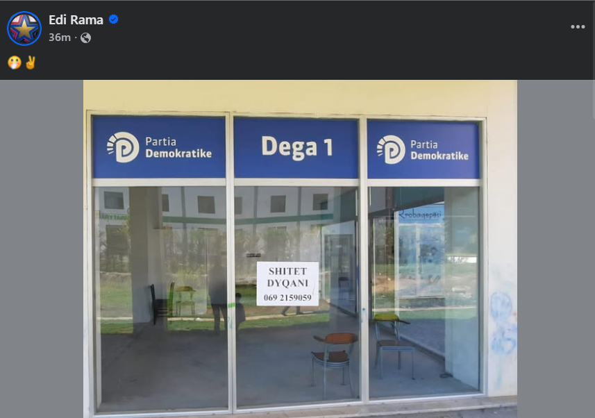 Kryeministri Edi Rama ka zgjedhour sot të ironizojë Partinë Demokratike, në lidhje me zgjedhjet e pjesshme lokale. Rama ka shpërndarë një foto nga Dega 1 e Partisë Demokratike në kryeqytet, ku në xham shihet njoftimi “Shitet dyqani”.