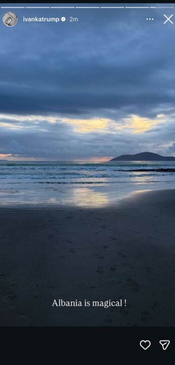Vajza e Presidentit të Shteteve të Bashkuara Donald Trump, Ivanka Trump ka publikuar sërish foto nga bregdeti i Vlorës. Ivanka ka publikuar një “Instastory” nga bregdeti, ndërsa krahas saj shkruan: “Shqipëria është magjike!”