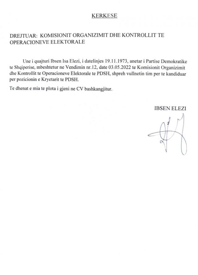 Sipas informacioneve për Gazeën Shqip, bëhet me dije se Ibsen Elezi e ka dorëzuar në selinë blu formularin e kandidimit.