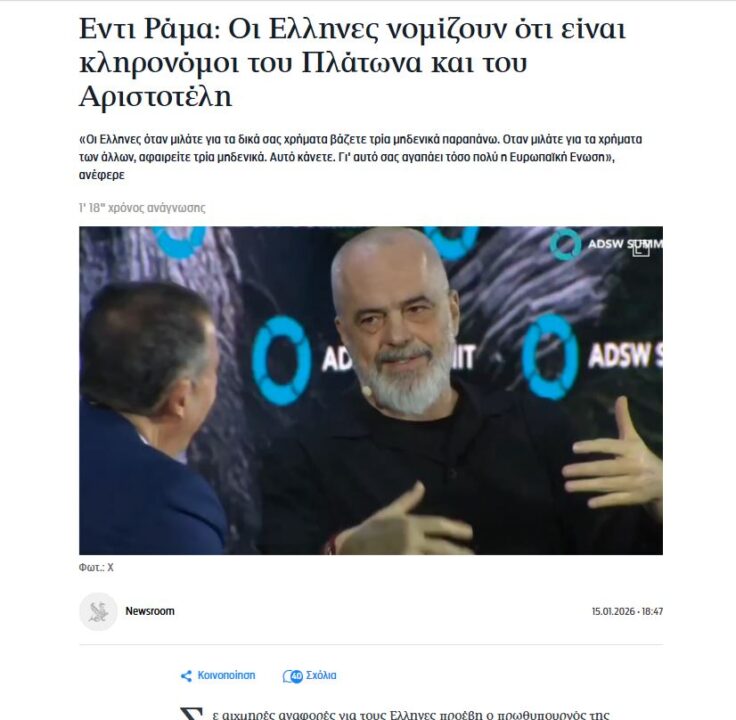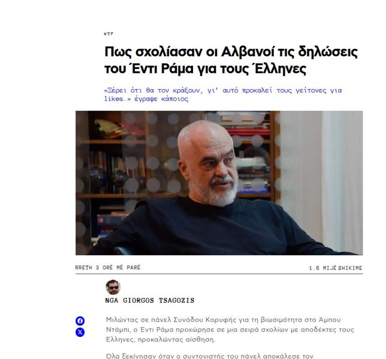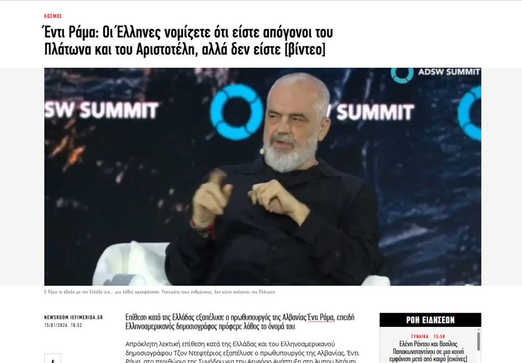Nga ana tjetër edhe “Iefimerida.gr” ka shkruar lidhur me batutën e Ramës: “Edi Rama: Grekët mendojnë se jeni pasardhës të Platonit dhe Aristotelit, por nuk jeni”.