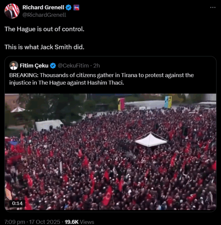 “Kjo është ajo që Jack Smith bëri”, shkruan Grenell duke iu referuar prokurorit që urdhëroi arrestimin e Hashim Thaçit.