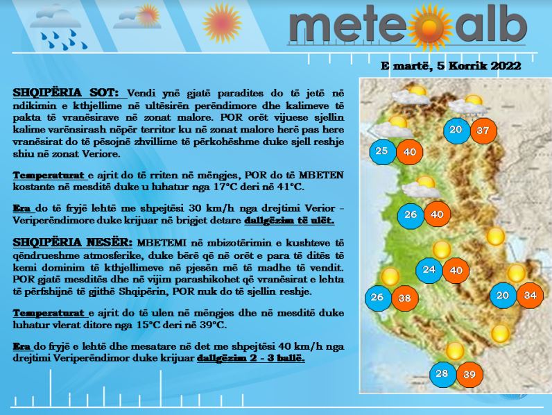 Temperaturat e ajrit do të rriten në mëngjes, por do të mbeten konstante në mesditë duke u luhatur nga 17 gradë Celsius deri në 41 gradë Celsius.