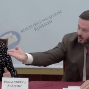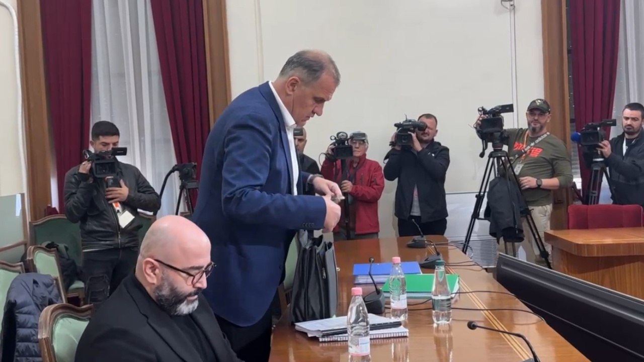 Ai ka nxjerrë nga çanta shishe uji për veten dhe për avokatin, që e shoqëron gjatë marrjes në pyetje nga anëtarët e Komisionit.