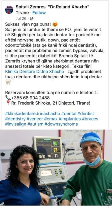 Brënda Spitalit të Zemrës kryhen të gjitha shërbimet dentare nën anestezi totale për këto kategori. Teksa flini, Klinika Dentare Dr.Ina Xhaxho zgjidh problemet tuaja dentare dhe rikthejnë shëndetin tuaj dentar”, thuhet në një nga postimet e bëra në Facebook.