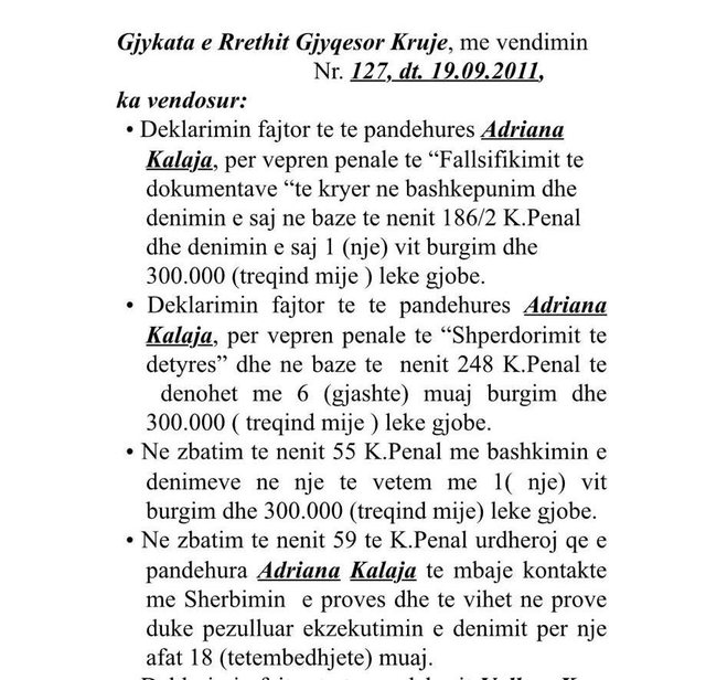 Adriana Kalaja shprehet se ditën e enjte, ka depozituar pranë Kryetarit të Partisë Demokratike, Sali Berisha dorëheqjen e parevokueshme si nga funksioni i Kryetares së Gjykatës, ashtu dhe nga Këshilli Kombëtar i Partisë Demokratike.