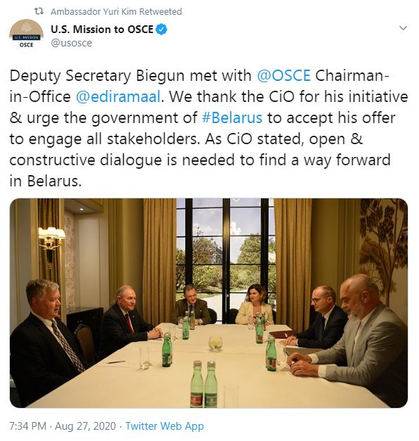 TIRANË- Ambasadorja e Shteteve të Bashkuara të Amerikës në Shqipëri, Yuri Kim ka vlerësuar iniciativën e Edi Ramës, në cilën e kreut të OSBE-së, për zgjidhur krizën në Bjellorusi. Teksa ka shpërndarë foto nga takimi i Ramës me Stephen Biegun, zëvendës sekretar i shtetit SHBA-së, Kim thekson nevojën për një dialog konstruktiv mes palëve për të gjetur një rrugëdalje në Bjellorusi.