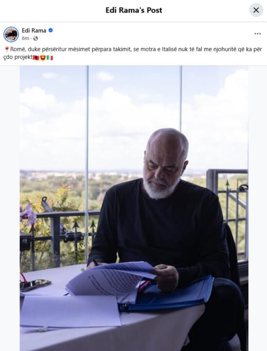 Në një postim në rrjetet sociale, kreu i qeverisë, ka ndarë një foto ndërsa shkruan “Romë, duke përsëritur mësimet përpara takimit, se motra e Italisë nuk të fal me njohuritë që ka për çdo projekt”.