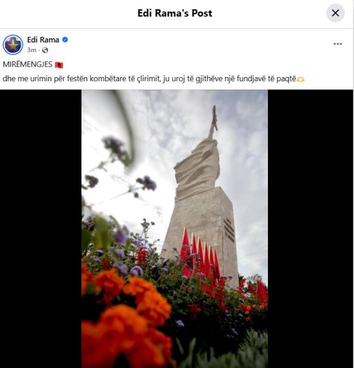 Kryeministri Edi Rama ka uruar 81-vjetorin e Çlirimit të vendit. Teksa ka ndarë një foto nga Memoriali “Nëna Shqipëri”, kreu i qeverisë ka shkruar: