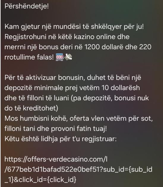 Mesazhi është shpërndarë nëpër rrjet me një reklamë joshëse për lojëra kazinosh, duke ofruar aktivizimin e vetëm 10 dollarëve depozitë dhe në këmbim përfitojë bonus 1200 dollarë. Në dukje kjo një reklamë krejt e zakonshme që bëjnë rëndom kompanitë e mëdha të lojërave të fatit nëpër botë për klientët e tyre.