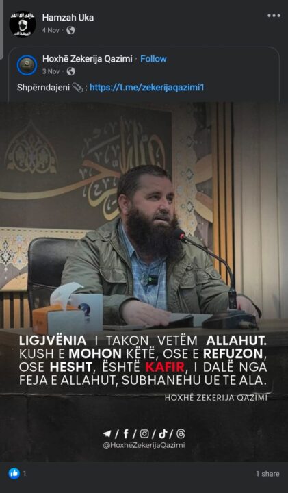 “LIGJVËNIA I TAKON VETËM ALLAHUT. KUSH E MOHON KËTË, OSE E REFUZON, OSE HESHT, ËSHTË KAFIR, I DALË NGA FEJA E ALLAHUT, SUBHANEHU UE TE ALA.”– theksohet në një postim.