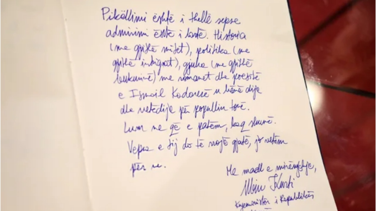 “Pikëllimi është i thellë sepse admirimi është i lartë. Historia (me gjithë mitet), politika (me gjithë intrigat), gjuha (me gjithë bukurinë) me romanet dhe poezitë e Ismail Kadaresë u bënë dije dhe vetëdije për popullin tonë. Lum ne që e patëm, kaq shumë. Vepra e tij do të rrojë gjatë, jo vetëm për ne”, shkroi Kurti në librin e kujtimeve.