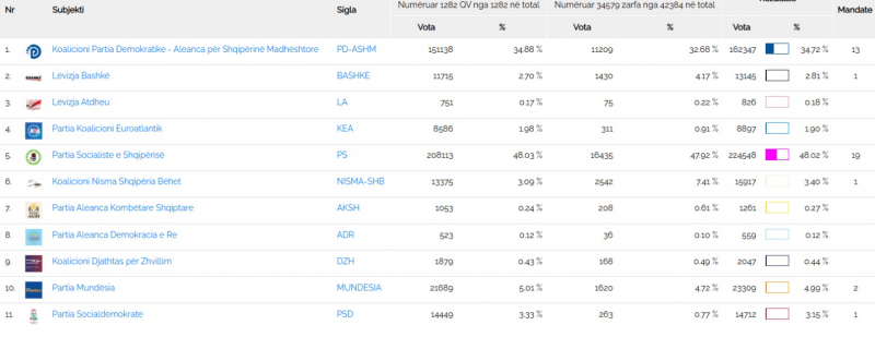 Sipas të dhënave zyrtare të KQZ-së, janë numëruar 34579 zarfe nga 42384 në total të ardhur nga Diaspora dhe në total, bashkë me votat e Shqipërisë, PS-ja ka një diferencë prej 62 mijë votash me PD-në, duke siguruar 19 mandate.