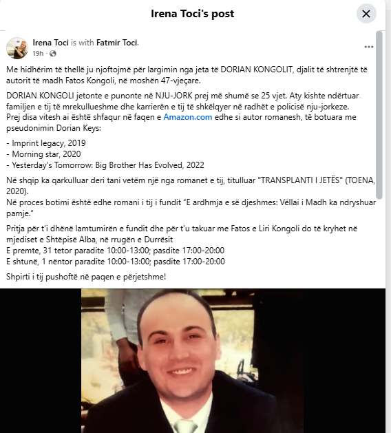 “Me hidhërim të thellë ju njoftojmë për largimin nga jeta të DORIAN KONGOLIT, djalit të shtrenjtë të autorit të madh Fatos Kongoli, në moshën 47-vjeçare.