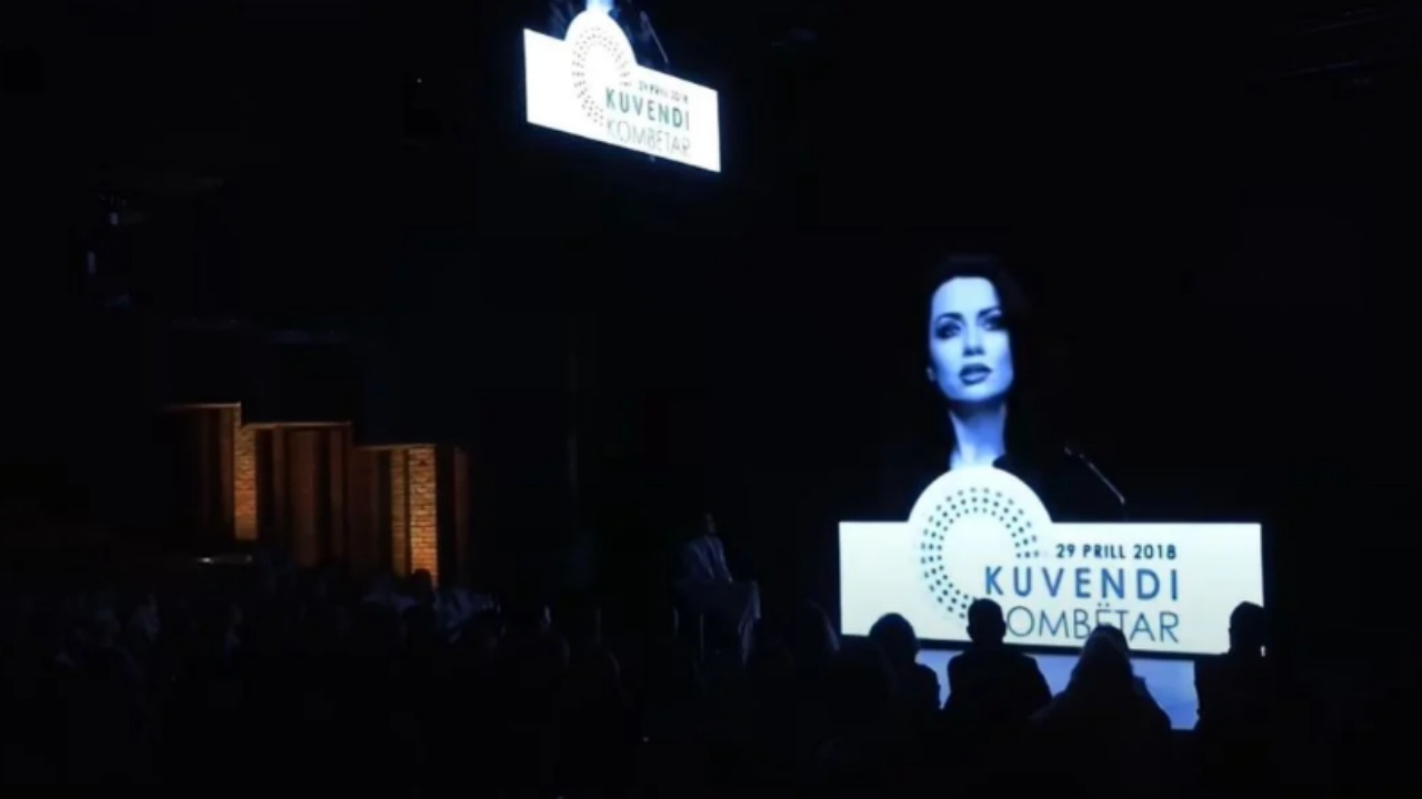 (Në ekran shfaqet momenti nga fjalimi i saj: Nuk ka dëm më të madh sesa të duash t’i lësh njerëzit e vendit tënd, të kombit tënd, të duash t’i lësh në varfëri, për t’ia përdorur varfërinë për një ditë të vetme, për t’ia rimarrë pushtetin. Në mundësi kjo Shqipëri bëhet, po ta shikosh në hartë është një vend i pasur në burime, në bekim, po ta shikosh nga dritarja Shqipëria jonë është një mjerim. Gruaja shqiptare është një heroinë, sepse fatkeqësisht nga njëra anë ka ditur përgjatë historisë së saj të durojë dhe burra të vegjël, por ka pasur aftësinë të lindë edhe të mëdhenj….” (shfaqet në ekran momenti kur rrëzohet nga shkallët e podiumit).