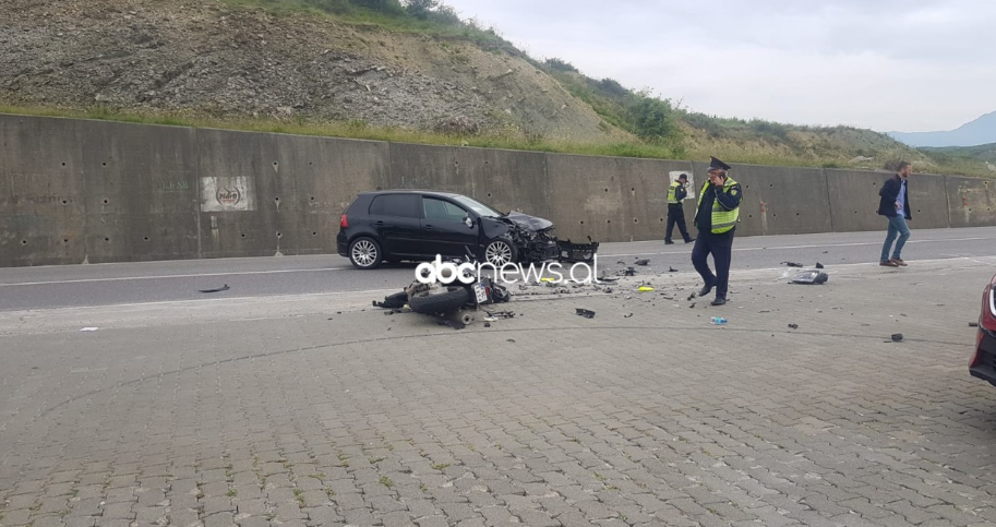 Turistët po udhëtonin me një motor, i cili pas përplasjes me një makinë. Nga fotot mund të shihet motori i shtrirë në mes të rrugës, me pjesë të saj të shpërndara gjerësisht në hapësirën e autostradës. Nga ana tjetër, edhe makina ka dëmtime serioze. Nuk dihet nëse drejtuesi i saj është plagosur nga ky aksident.