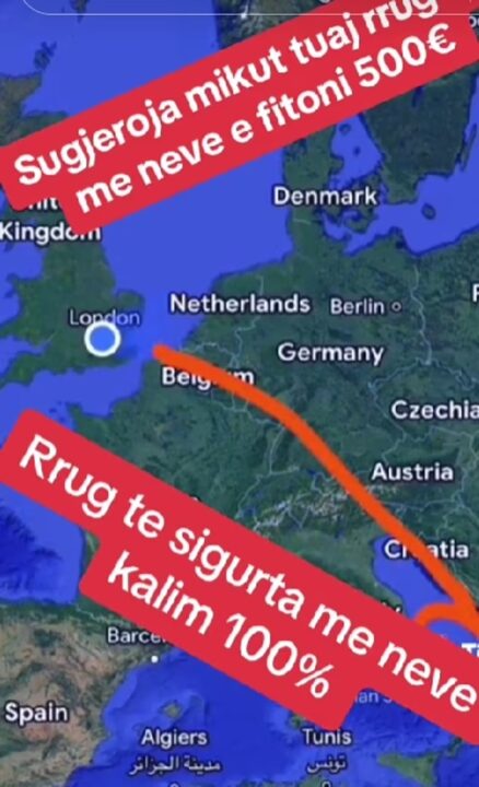 Një tjetër, që tregon një hartë që përshkruan me një vijë të kuqe rrugën nga Shqipëria në Kanalin e La Mansh, ofron “udhëtime 100% të garantuara (të sigurta) me ne”, duke shtuar: “Rekomandoni udhëtimet tona mikut tuaj dhe fitoni 500 €”.