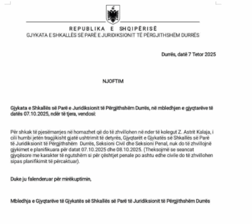 Në shenjë respekti dhe homazhi për gjyqtarin Astrit Kalaja, i cili humbi jetën tragjikisht gjatë ushtrimit të detyrës në Gjykatën e Apelit Tiranë, Gjykata e Shkallës së Parë të Juridiksionit të Përgjithshëm në Durrës ka vendosur pezullimin e seancave gjyqësore për datat 7 dhe 8 tetor 2025.