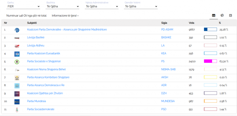 Partia Socialiste kryeson me 24210 vota, ndërsa koalicioni opozitar 9667 vota.