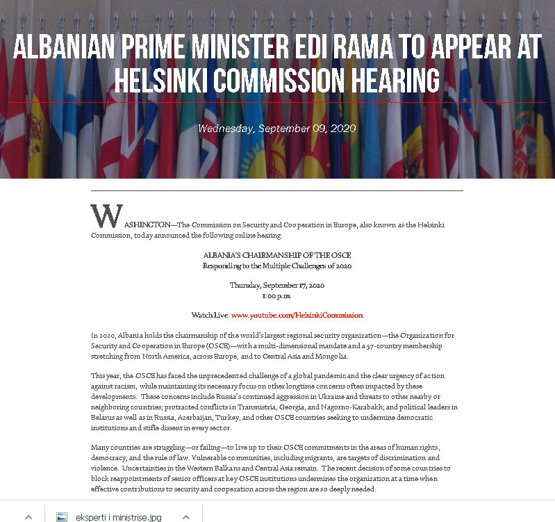 Komisioni i Helsinkit rregullisht mban një seancë dëgjimore që lejon kryesimin vjetor të radhës së OSBE-së të paraqesë përparësitë e tij për vitin dhe të shkëmbejë mendime mbi çështjet aktuale. Kryeministri shqiptar Edi Rama, i cili mban postin e drejtuesit të Punëve të Jashtme të vendit të tij, do të paraqitet në këtë seancë për të diskutuar punën e OSBE-së deri më tani në 2020 dhe për të ndarë pikëpamjet e tij përpara mbledhjes së Këshillit Ministror të OSBE të planifikuar për në fillim të dhjetorit”, thuhet në njoftimin e Komisioni të Helsinkit.