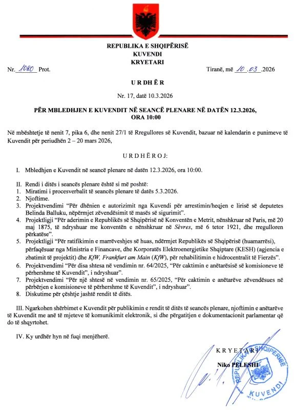 Të enjten, më 12 mars, Kuvendi i Shqipërisë pritet të rrëzojë kërkesën e SPAK për dhënien e autorizimit për arrestimin e deputetes Belinda Balluku. Sipas rendit të ditës, kjo pikë do të shqyrtohet e para, menjëherë pas nisjes së seancës plenare në ora 10:00.