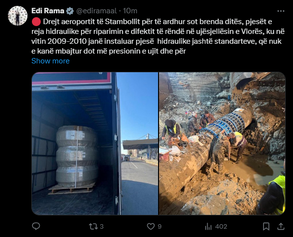 “Drejt aeroportit të Stambollit për të ardhur sot brenda ditës, pjesët e reja hidraulike për riparimin e difektit të rëndë në ujësjellësin e Vlorës, ku në vitin 2009-2010 janë instaluar pjesë hidraulike jashtë standarteve, që nuk e kanë mbajtur dot më presionin e ujit dhe për pasojë tubacioni ka shpërthyer…