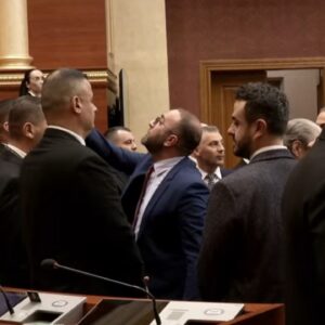 “Si nuk u lodhe o burrë”, dëgjohet Peleshi duke iu drejtuar Gazment Bardhit i cili fliste mbi fjalën e tij duke kërkuar largimin e zv. kryeministres nga salla e Kuvendit.