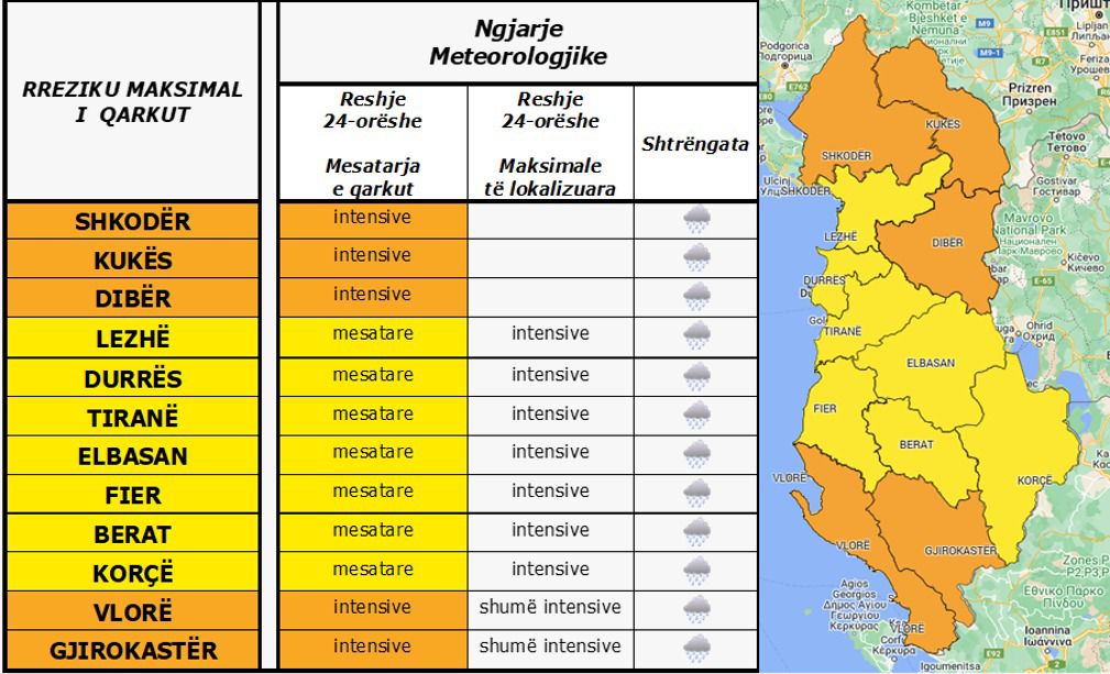 “Në 23 dhjetor, reshje intensive deri shumë intensive do të përfshijnë qarqet Vlorë, Gjirokastër, Shkodër, Kukës dhe Dibër, ndërsa në zonat e tjera reshjet do të jenë mesatare deri intensive, të shoqëruara me shtrëngata.
