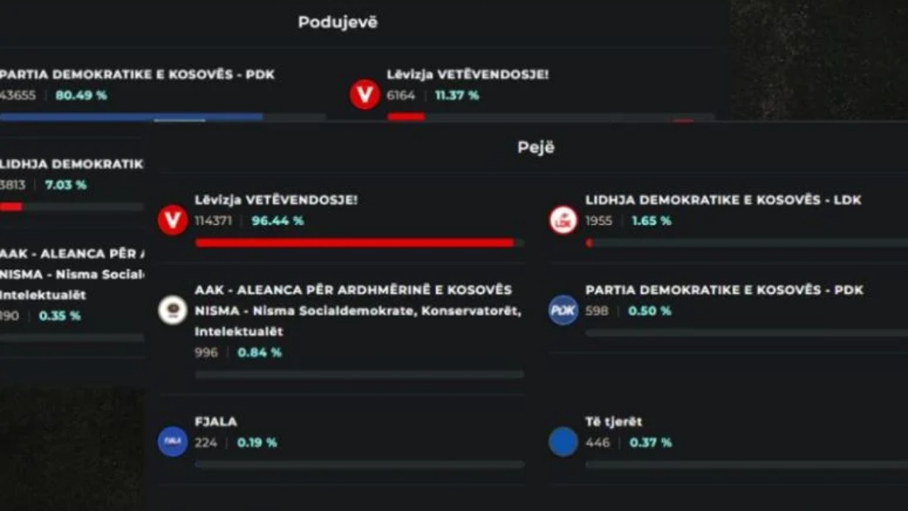 Në komunën e Pejës, të dhënat e publikuara tregojnë se Lëvizja Vetëvendosje (VV) ka grumbulluar 96.44% të votave, një përqindje jashtëzakonisht e lartë.