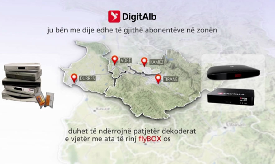Në kuadër të procesit të dixhitalizimit që vijon me radhë në qarqet e vendit, “DigitAlb” njofton abonentët në zonën e Tiranës, Kamzës, Vorës e Durrësit, që kanë ende një dekoder apo modul të vjetër tokësor SD, që duhet ta konvertojnë me një dekoder flyBOX ose T2-HD, për të përftuar programet në sistemin dixhital.