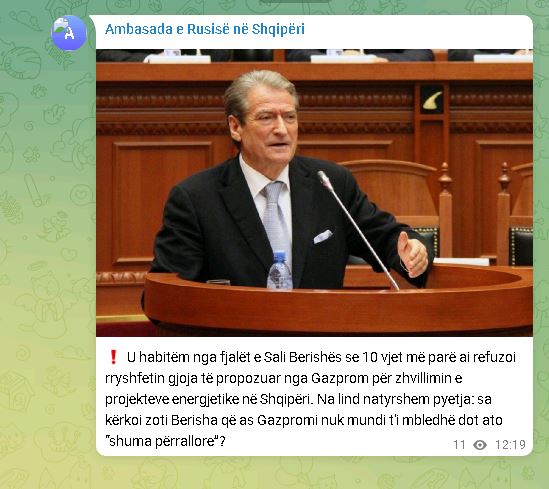 “U habitëm nga fjalët e Sali Berishës se 10 vjet më parë ai refuzoi rryshfetin gjoja të propozuar nga Gazprom për zhvillimin e projekteve energjetike në Shqipëri. Na lind natyrshem pyetja: sa kërkoi zoti Berisha që as Gazpromi nuk mundi t’i mbledhë dot ato “shuma përrallore”?”, reagon ambasada në rrjetin social Telegram.