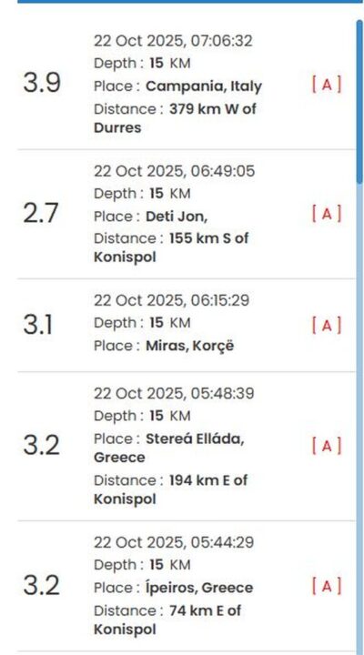 Një seri tërmetesh janë regjistruar në vendin tonë. Sipas të dhënave, tërmeti i parë është regjistruar në Durrës, me magnitudë 3.9.