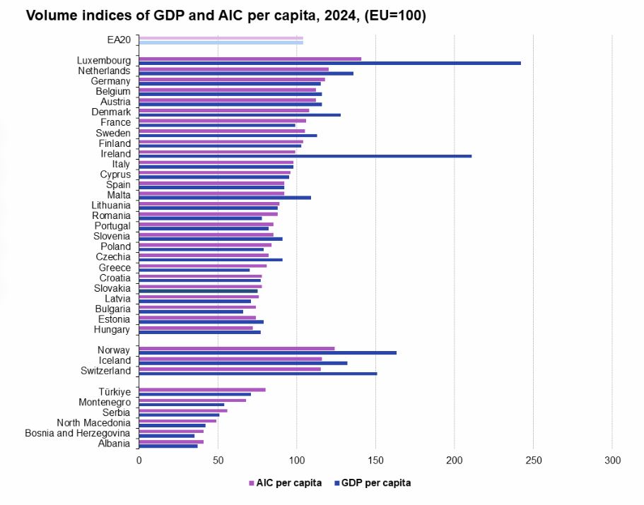 Në vitin 2024, konsumi individual aktual (AIC) për frymë, i shprehur në standardin e fuqisë blerëse (PPS), varionte nga 72% deri në 141% të mesatares së BE-së në të 27 vendet anëtare të Bashkimit Europian.